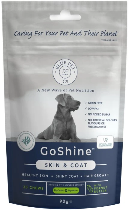 Blue Pet GoShine on makupalan muodossa oleva lisäravinne, joka edistää turkin, ihon ja kynsien terveyttä kaiken ikäisille, -rotuisille ja -kokoisille koirille. Hauska ja helppo annostella!