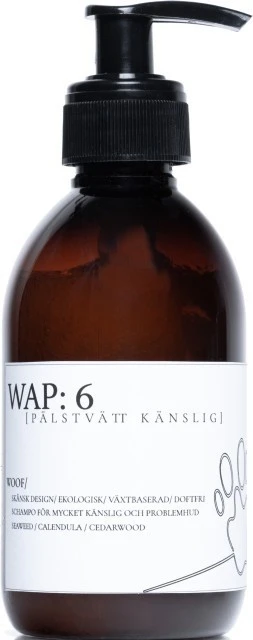 WAP: 6 Fur wash Sensitive on mieto ja hajusteeton shampoo koirille, joilla on herkkä tai vaurioitunut iho. Hellävarainen shampoo ravitsee koiran ihoa ja hoitaa turkkia. Shampoo sisältää muun muassa Bis-Diglyseryl polyasyladipate-1:tä, joka on kasvipohjainen vaihtoehto lanoliinille.